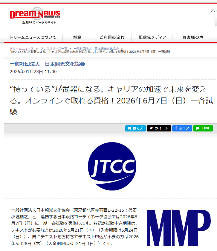 一般社団法人日本観光文化協会(東京都北区赤羽西1-22-15:代表 小塩稲之)と、連携する日本販路コーディネータ協会では2026年6月7日(日)に上期一斉試験を実施します。各認定試験申込期限は、テキストが必要な方は2026年5月21日(木)(入金期限は5月24日(日))、既にテキストをお持ちでテキスト申込が不要の方は2026年5月28日(木)(入金期限は5月31日(日))です。