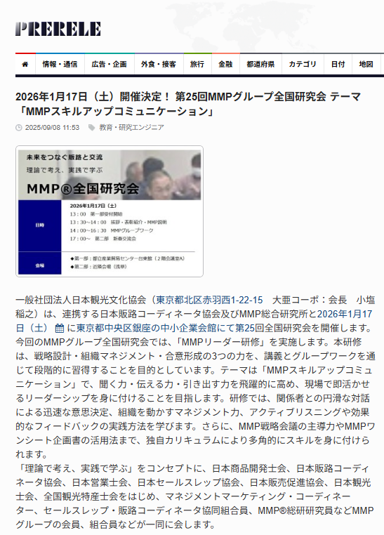 一般社団法人日本観光文化協会(東京都北区赤羽西1-22-15 大亜コーポ:会長 小塩稲之)は、連携する日本販路コーディネータ協会及びMMP総合研究所と2026年1月17日(土) に東京都中央区銀座の中小企業会館にて第25回全国研究会を開催します。 今回のMMPグループ全国研究会では、「MMPリーダー研修」を実施します。本研修は、戦略設計・組織マネジメント・合意形成の3つの力を、講義とグループワークを通じて段階的に習得することを目的としています。テーマは「MMPスキルアップコミュニケーション」で、聞く力・伝える力・引き出す力を飛躍的に高め、現場で即活かせるリーダーシップを身に付けることを目指します。研修では、関係者との円滑な対話による迅速な意思決定、組織を動かすマネジメント力、アクティブリスニングや効果的なフィードバックの実践方法を学びます。さらに、MMP戦略会議の主導力やMMPワンシート企画書の活用法まで、独自カリキュラムにより多角的にスキルを身に付けられます。 「理論で考え、実践で学ぶ」をコンセプトに、日本商品開発士会、日本販路コーディネータ協会、日本営業士会、日本セールスレップ協会、日本販売促進協会、日本観光士会、全国観光特産士会をはじめ、マネジメントマーケティング・コーディネーター、セールスレップ・販路コーディネータ協同組合員、MMP®総研研究員などMMPグループの会員、組合員などが一同に会します。