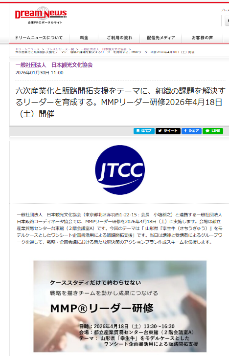 Dream Newsに「六次産業化と販路開拓支援をテーマに、組織の課題を解決するリーダーを育成する。MMPリーダー研修2026年4月18日(土)開催」が掲載されました。